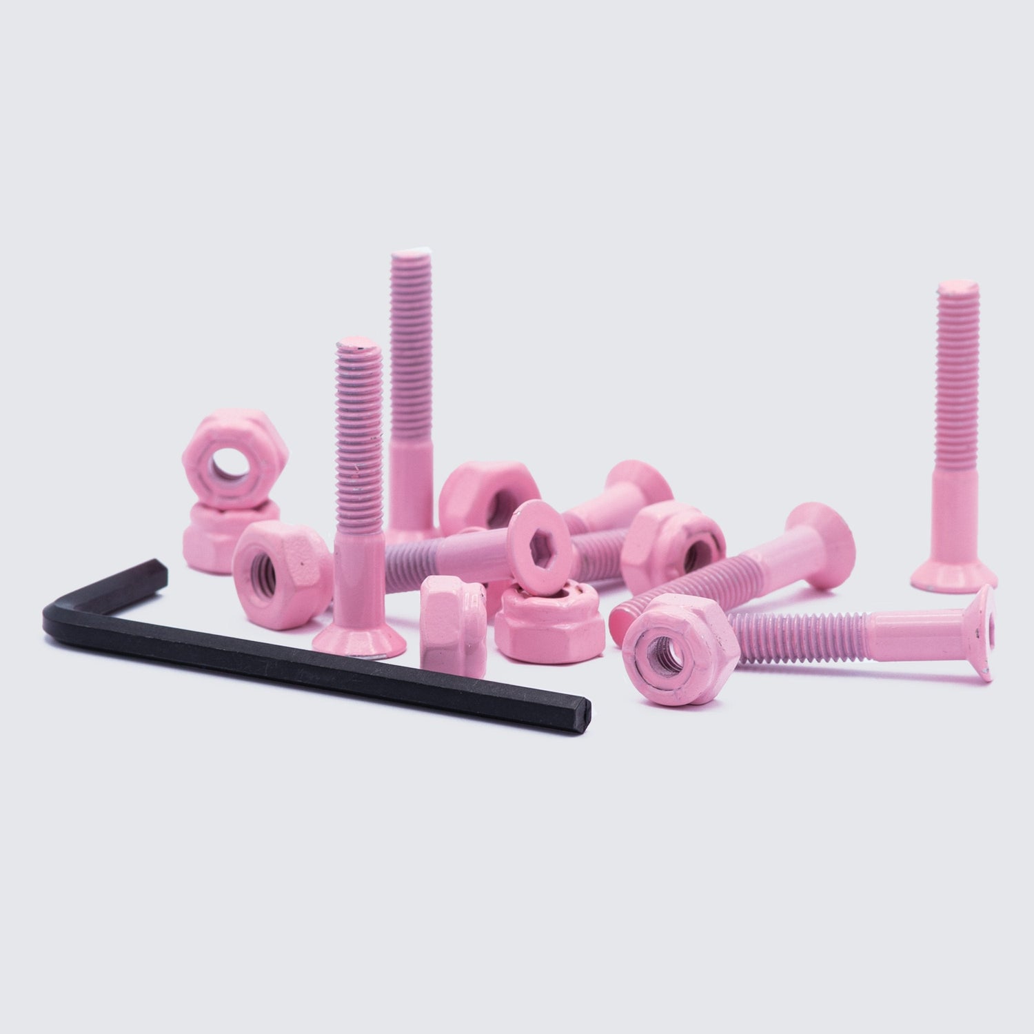 The Octo-Hex Skateboard Hardware Pack comes with 8 hex-head bolts and 8 locknuts. That's enough stuff to install two trucks once or one truck twice. At 1" in length, the bolts are perfect for set-ups without risers or shock pads, but also perfectly suitable for set-ups using a small 1/8" (3mm) riser or shock pad. If running a taller shock pad, or just preferring longer bolts, 1.25" will do the trick. The locknuts with nylon retainer rings will keep things in place even under the hardest skating. Available in Black, Pink, Party Time or Classic Chrome, grab a set and get your hex on.